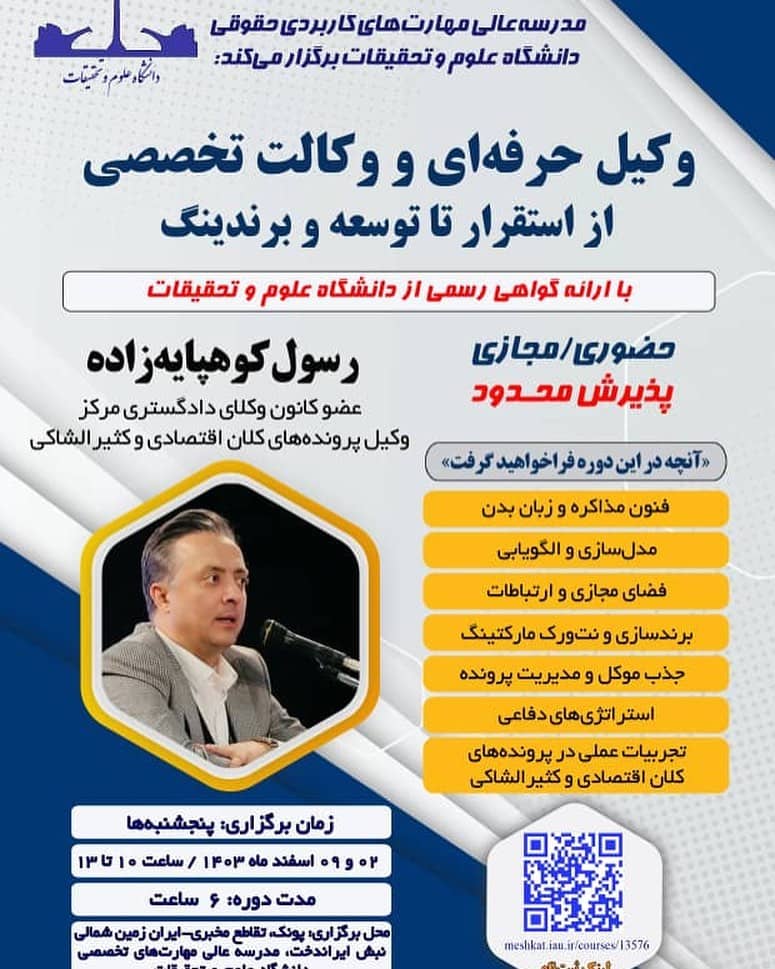 مدرسه عالی مهارت‌های کاربردی حقوقی علوم و تحقیقات برگزار می‌کند: