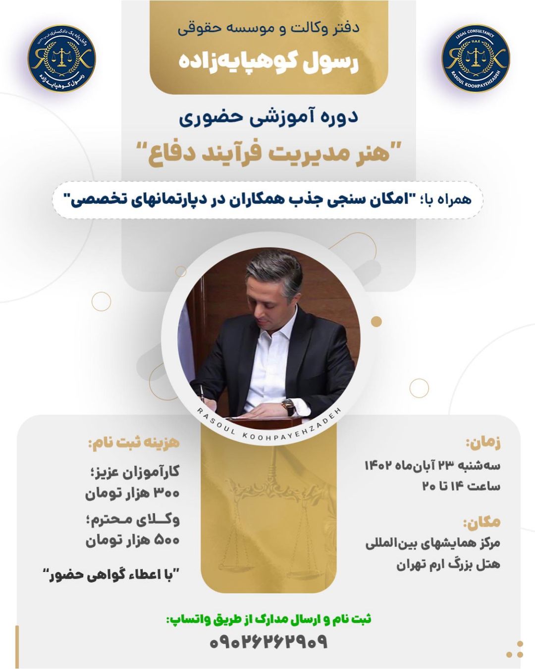 لازم به ذکر است که گواهی دوره برای همه شرکت کنندگان به اعتبار دفتر وکالت و موسسه حقوقی رسول کوهپایه زاده صادر خواهد شد؛