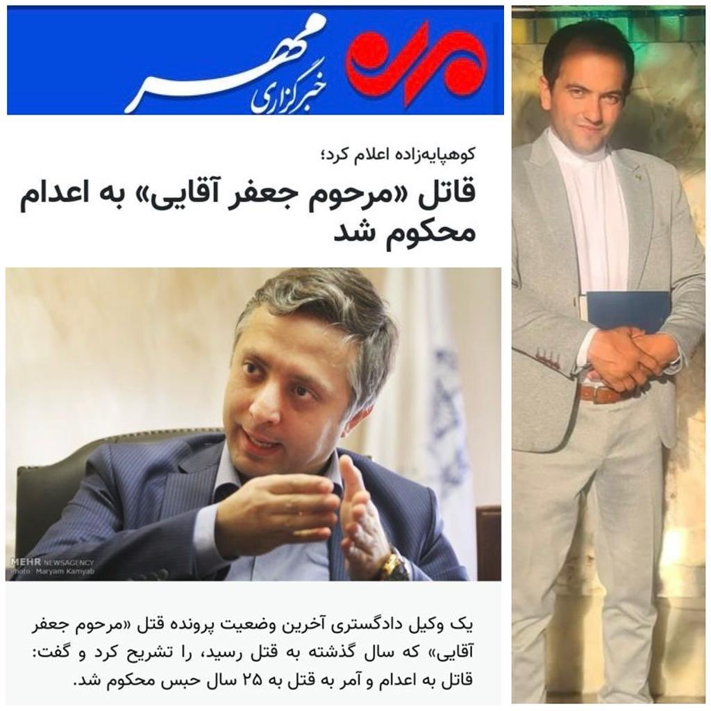 وی افزود: در خصوص آمر قتل، کسی که با پرداخت وجه و اجیر کردن اشخاص، دستور قتل را صادر کرده بود؛ به اتهام معاونت در قتل به اشد مجازات یعنی تحمل ۲۵ سال حبس محکوم شد. آمر به قتل، پدر موکل سابق جعفر آقایی بود که برای جلوگیری از افشای ابعاد گسترده پرونده فساد مالی، پولشویی و اخلال در نظام اقتصادی دستش به قتل همکار مظلومم آلوده شد.