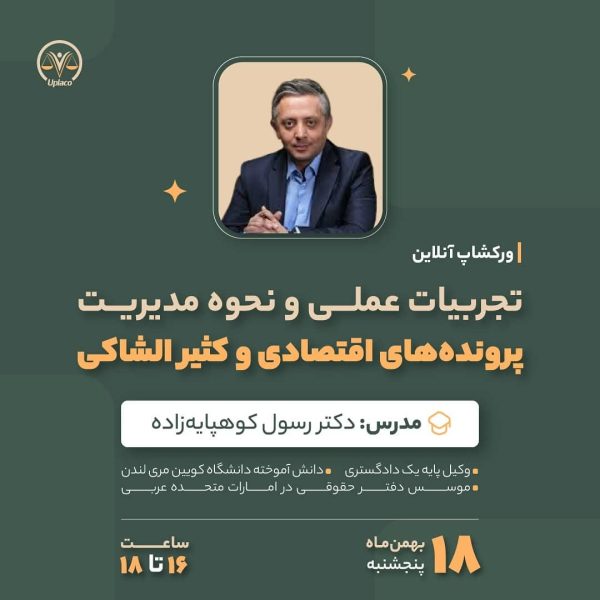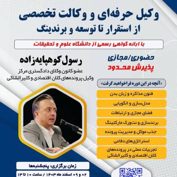 ورکشاپ تخصصی «تجربیات عملی و نحوه مدیریت پروندههای اقتصادی و کثیرالشاکی»مدیر سایت8 بهمن 1403ورکشاپ تخصصی «تجربیات عملی و نحوه مدیریت پروندههای اقتصادی و کثیرالشاکی» با حضور دکتر رسول کوهپایهزاده، وکیل پایه یک دادگستری ...