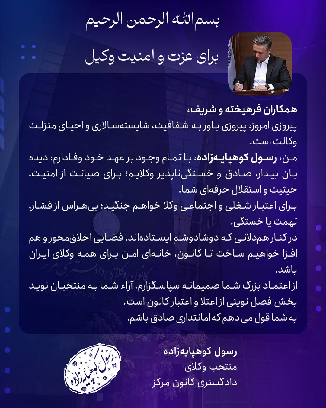 همكاران عزيزم ؛ وكلاي شريف و فرهيخته ، انتخابات پيش رو يك مسئوليت و فرصت تاريخي است…