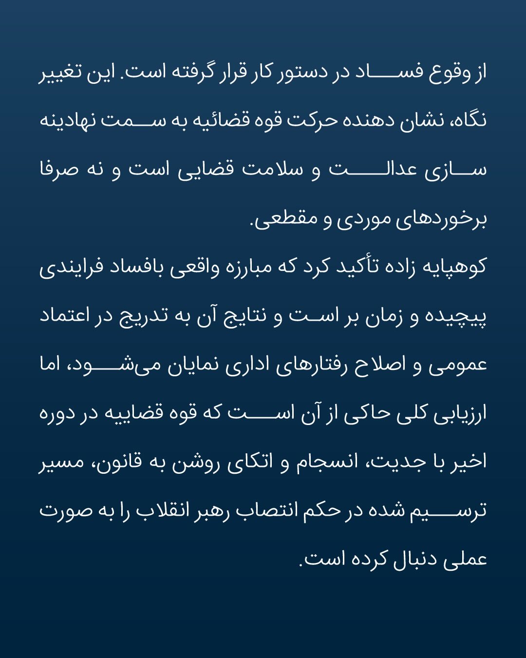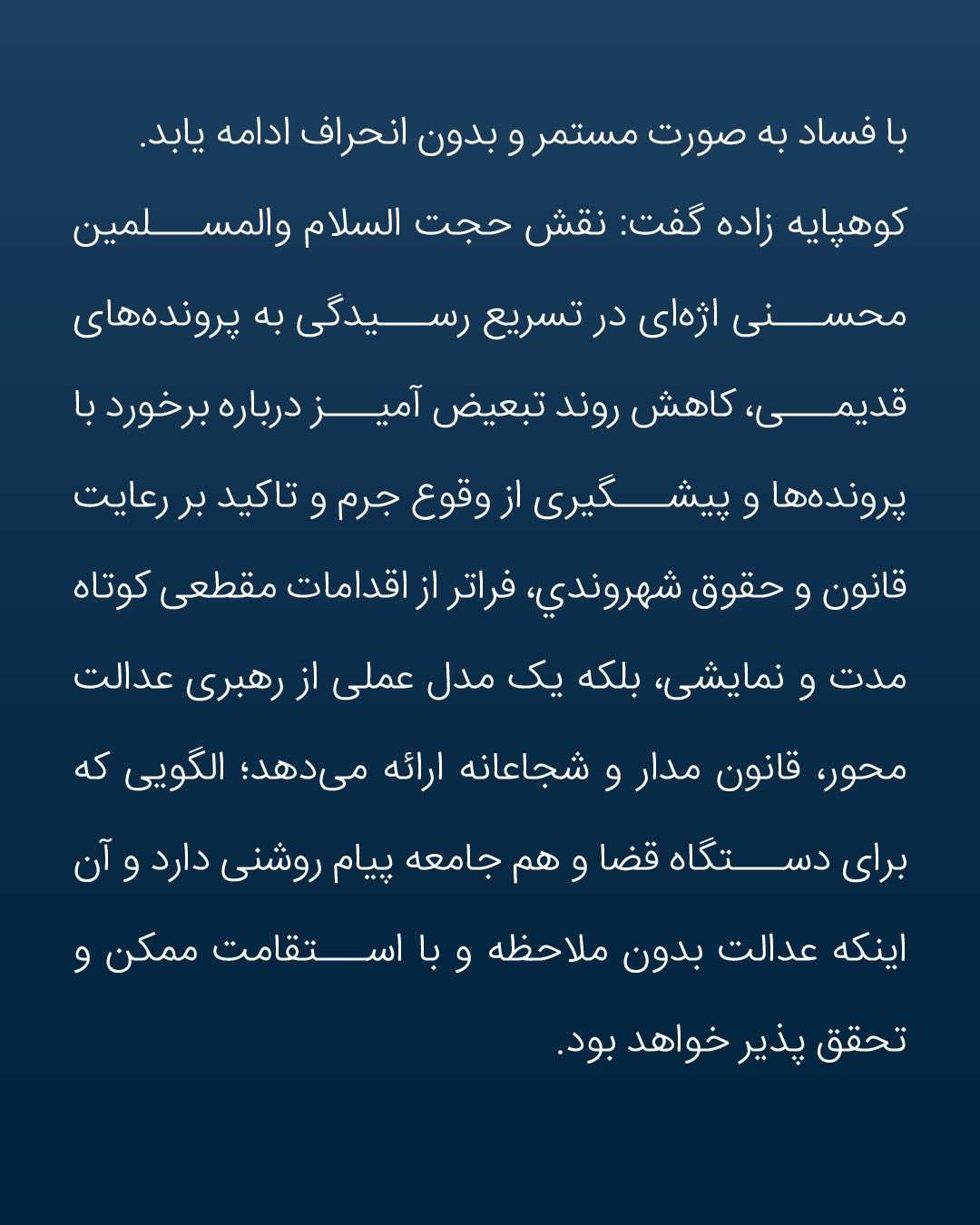 كوهپايه زاده گفت: توانمندی رئیس فعلی قوه قضاییه در مدیریت پرونده‌های کلان، نشان دهنده هوشمندی و جدیت در رسیدگی قضايي است و شجاعت و صلابت او در برابر فشـار‌های رسانه اي و سیاسی موجب شده مسیر مبارزه با فساد به صورت مستمر و بدون انحراف ادامه یابد.