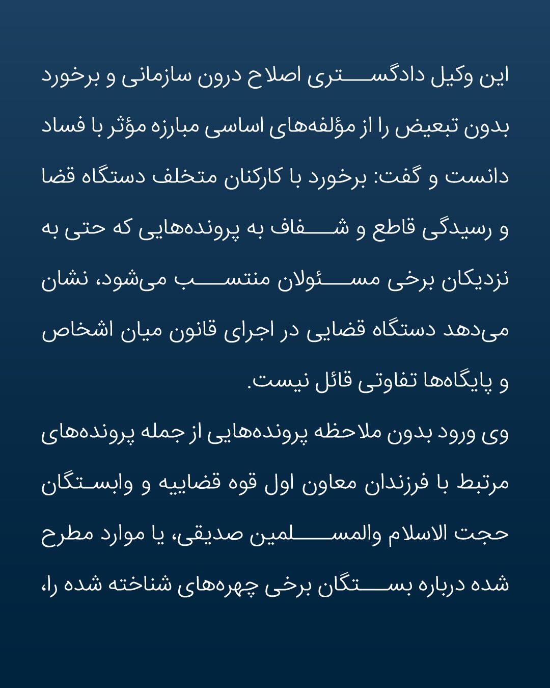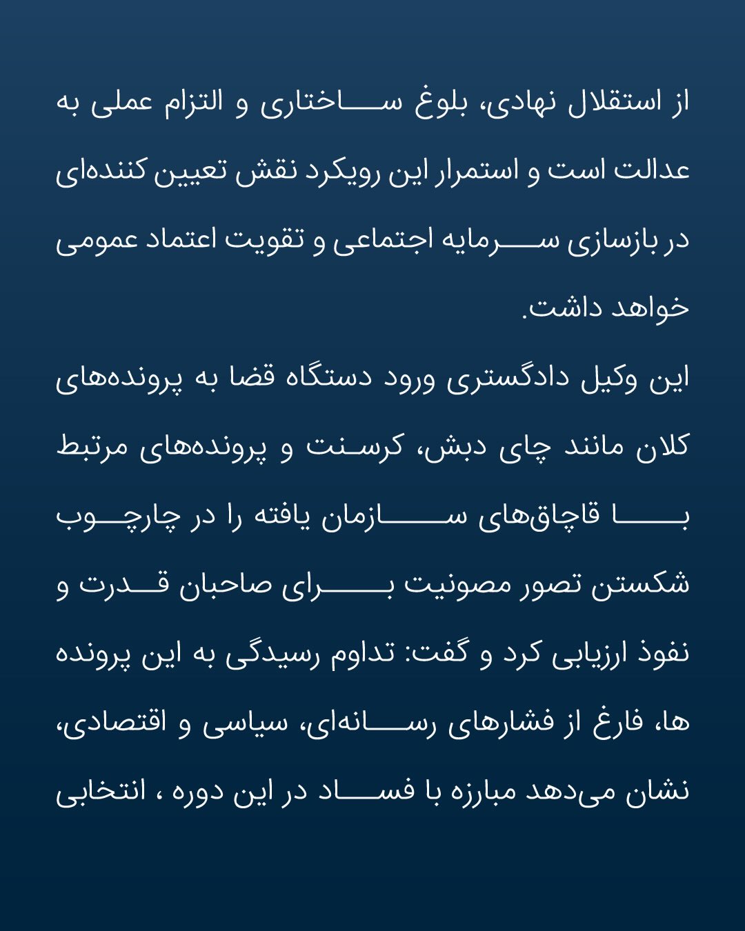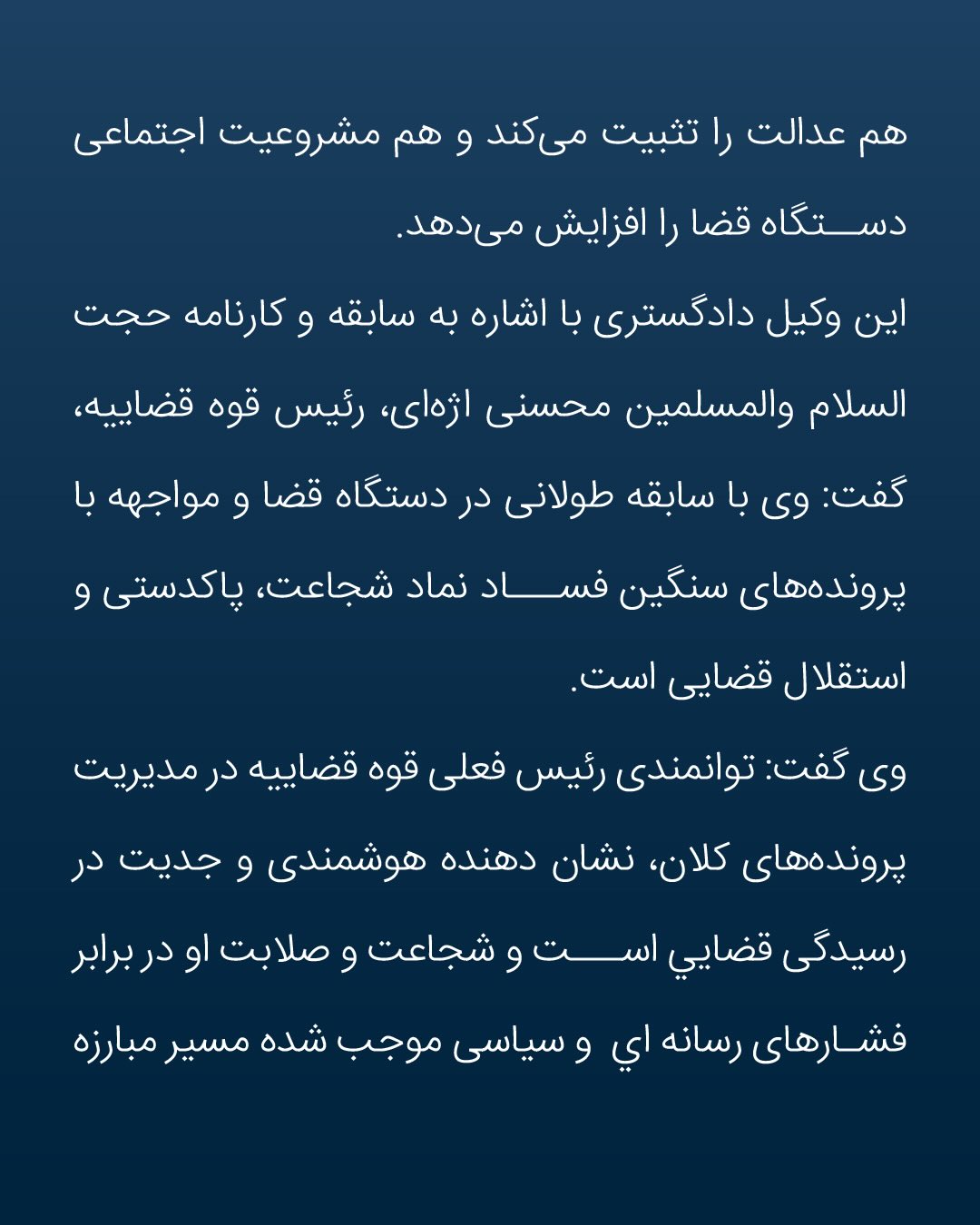 اين وکیل دادگستری با اشاره به سابقه و کارنامه حجت السلام والمسلمین محسنی اژه‌ای، رئیس قوه قضاییه، گفت: وی با سابقه طولانی در دستگاه قضا و مواجهه با پرونده‌های سنگین فساد نماد شجاعت، پاکدستی و استقلال قضایی است.