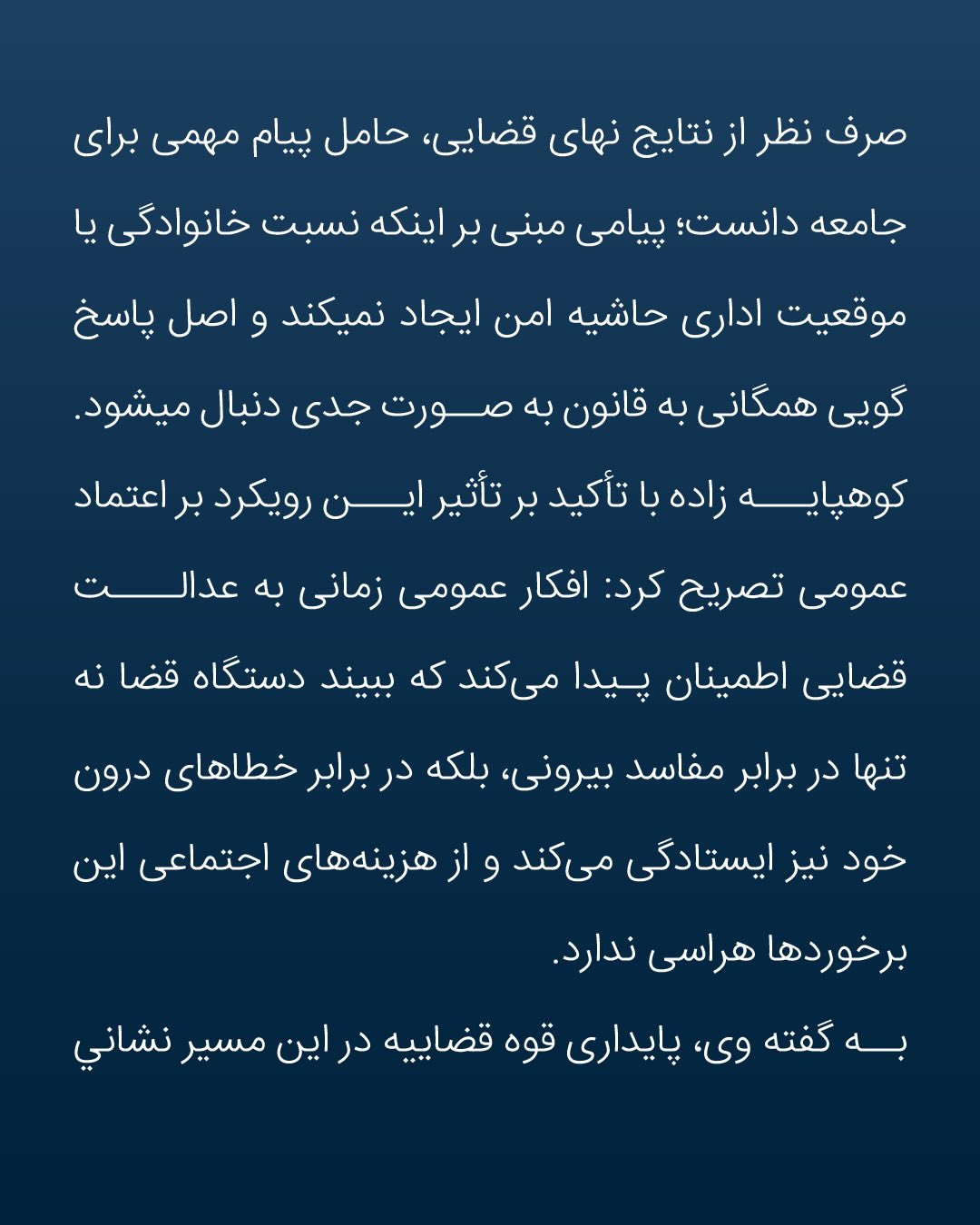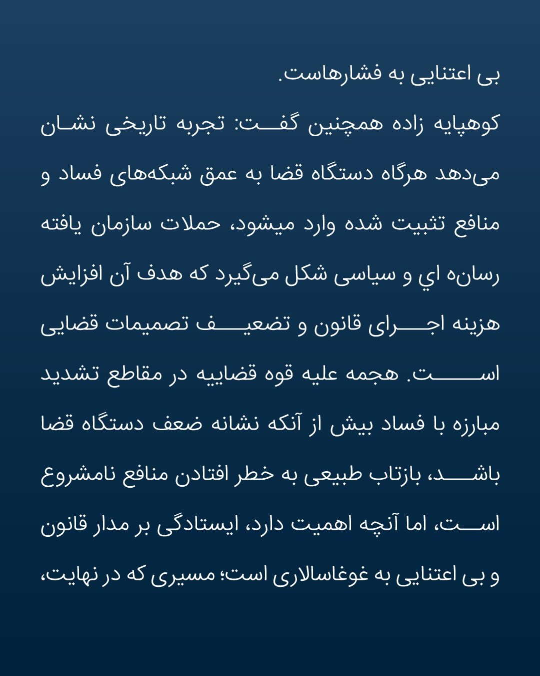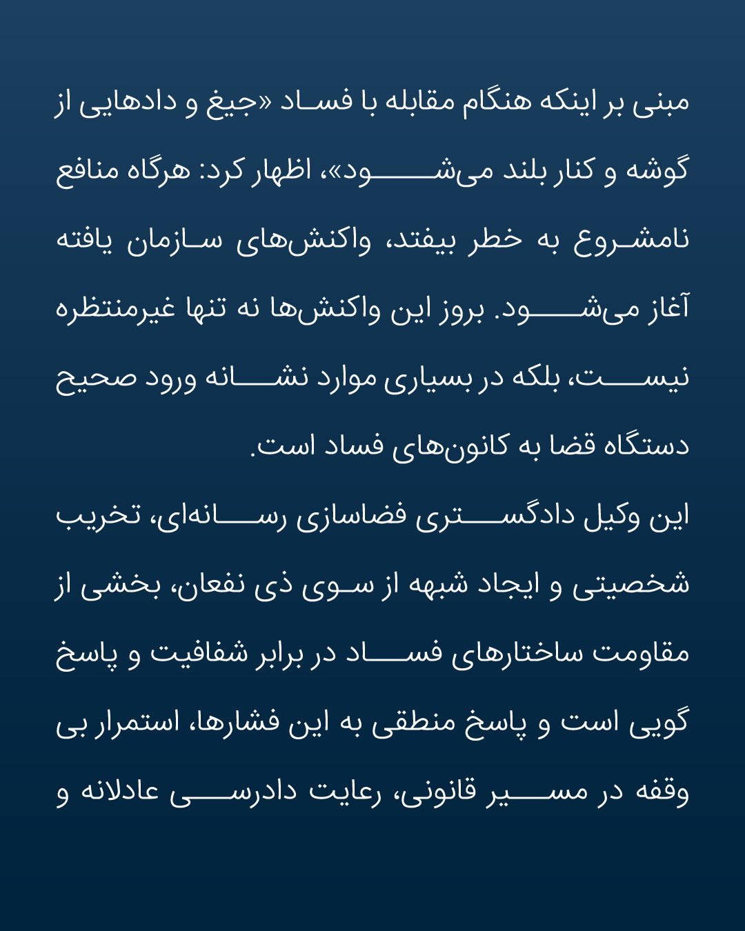 تجربه تاریخی نشـان می‌دهد هرگاه دستگاه قضا به عمق شبکه‌های فساد و منافع تثبیت شده وارد میشود، حملات سازمان یافته رسان‌ه اي و سیاسی شکل می‌گیرد که هدف آن افزایش هزینه اجرای قانون و تضعیف تصمیمات قضایی اســت. هجمه علیه قوه قضاییه در مقاطع تشدید مبارزه با فساد بیش از آنکه نشانه ضعف دستگاه قضا باشد، بازتاب طبیعی به خطر افتادن منافع نامشروع اســت، اما آنچه اهمیت دارد، ایستادگی بر مدار قانون و بی اعتنایی به غوغاسالاری است؛ مسیری که در نهایت، هم عدالت را تثبیت می‌کند و هم مشروعیت اجتماعی دســتگاه قضا را افزایش می‌دهد.