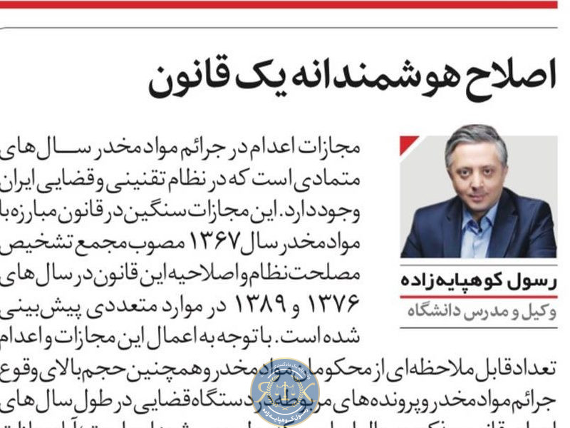 “اصلاح هوشمندانه يك قانون” يادداشت اينجانب در مورد تعديل مجازات إعدام در جرايم مواد مخدر ؛ روزنامه فرهيختگان، دوشنبه ٢ بهمن ٩٦ مجازات اعدام در جرائم مواد مخدر سالهای متمادي است که در نظام تقنيني و قضائي ایران وجود دارد. این مجازات سنگین در قانون مبارزه با مواد مخدر سال1367 مصوب مجمع تشخیص مصلحت نظام و اصلاحیه این قانون در سال های 1376 و 1389 در موارد متعددی پيش بيني شده است. با توجه به اعمال این مجازات و اعدام تعداد قابل ملاحظهای از محکومین مواد مخدر و همچنین حجم بالای وقوع جرائم مواد مخدر و پروندههای مربوطه در دستگاه قضایی در طول سالهای اجرای قانون مذکور ؛ سوال اساسی که مطرح میشود این است؛ آیا مجازات اعدام قادر به تحقق اهداف قانونگذار از وضع و اعمال این کیفر بوده است وآیا اساسا اهداف اعمال مجازات به ویژه بازدارندگی عام و جلوگیری از تکرار آن را محقق ساخته است؟ با بررسی وضعیت و واقعیات ملموس جامعه و ملاحظه آمارهای رسمی و مستندات منتشره مشاهده میشود کیفر اعدام در جرائم مواد مخدر نتوانسته اهداف مورد نظر را محقق نماید: