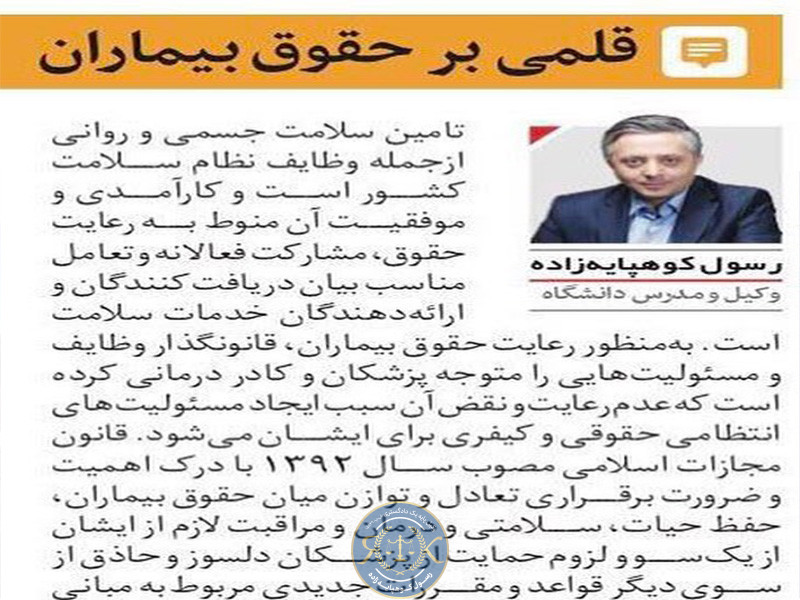 بخشي از يادداشت اينجانب در روزنامه فرهيختگان،يكشنبه ٩ ارديبهشت در مورد حقوق بيماران و جرائم و تخلفات پزشكان. تامین سلامت جسمی و روانی ازجمله وظایف نظام سلامت کشور است و کارآمدی و موفقیت آن منوط به رعایت حقوق، مشارکت فعالانه و تعامل مناسب ميان دریافت کنندگان و ارائهدهندگان خدمات سلامت است. به منظور رعایت حقوق بیماران، قانونگزار وظایف و مسئولیتهایی را متوجه پزشکان و کادر درمانی نموده است که عدم رعایت و نقض آن سبب ایجاد مسئولیتهای انتظامی حقوقی و کیفری برای ایشان میشود. قانون مجازات اسلامی مصوب سال 1392 با درک اهمیت و ضرورت برقراری تعادل و توازن میان حقوق بیماران، حقظ حیات، سلامتی و درمان و مراقبت لازم از ایشان از یک سو و لزوم حمایت از پزشکان دلسوز و حاذق از سوی دیگر قواعد و مقررات جدیدی مربوط به مبانی مسئولیت پزشکان وضع نموده است که با موازین اخلاقي و عرفی در باب حقوق پزشکی همخوانی بیشتری دارد اختصاص 5 ماده (مواد 158، 295، 495، 496 و 497) به این مهم با رویکرد حمایت و اعطا آزادی عمل بیشتر به پزشکان نسبت به قانون مجازات سابق که پزشک به عنوان مسئول مطلق شناخته میشد قابل توجه است. براساس ماده 495 قانون مجازات اسلامی «هرگاه پزشک در معالجاتی که انجام میدهد موجب تلف یا صدمه بدنی گردد، ضامن دیه است مگر آنکه عمل او مطابق مقررات پزشکی و موازین فنی باشد و یا اینکه قبل از معالجه برائت گرفته باشد و مرتکب تقصیری هم نشود…» مطابق ماده 496 قانون مذکور، ((پزشک در معالجاتی که دستور انجام آن را به مریض یا پرستار و مانند آن صادر مینماید، در صورت تلف یا صدمه بدنی ضامن است مگر اینکه مطابق ماده 495 این قانون عمل نماید.)) همچنین به استناد بند ج ماده 158 قانون اخیرالذکر هر نوع عمل جراحی یا طبی که بدون رعایت موازین فنی و علمي و نظامات دولتی انجام شود وموجب بروز خسارت جانی گردد جرم محسوب شده و قابل مجازات است. مرجع احراز جرم و تعیین مجازات، مراجع قضایی اعم از دادسرا و دادگاههای کیفری است که البته به لحاظ تخصصی بودن موضوع از نظريات کارشناسی سازمان نظام پزشکی و سازمان پزشکی قانونی نیز استفاده میشود ولی النهایه تعیین تقصیر یا قصور و میزان آن و یا احراز بیگناهی و عدم ارتکاب جرم پزشک ،برعهده قاضی صادرکننده رای است. چنانچه اعمال ارتکابی پزشکان متضمن یکی از عناوین مجرمانه مانند قتل یا ضرب و جرح و نقص عضو اعم از عمدی یا غیرعمدی باشد با مرتکب آن مطابق با مجازاتهای مندرج در قوانین جزایی عمل خواهد شد که حسب مورد مجازاتهایی مانند حبس، جزای نقدی، پرداخت دیه و …