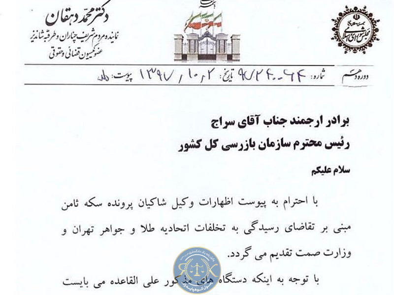 پس از مصاحبه و اطلاع رساني اينجانب در خصوص تخلفات انجام شده از سوي وزارت صمت و اتحاديه طلا و جواهر تهران در پرونده سكه ثامن، نماينده شجاع، شريف و دلسوز ملت، جناب آقاي دكتر دهقان، عضو محترم كميسيون قضايي و حقوقي مجلس، طي نامه شمار٩٧٢٤٠٠٦٤ مورخ ٩٧/١٠/٢ خطاب به رياست محترم سازمان بازرسي كل كشور، جناب آقاي قاضي سراج،تسريع در رسيدگي و برخورد قاطع با متخلفان را مورد تاكيد قرار دادند.