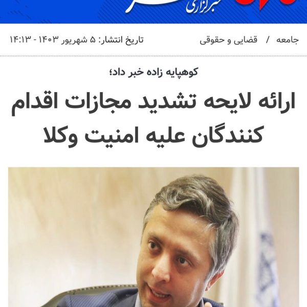 ارائه لایحه تشدید مجازات اقدام کنندگان علیه امنیت وکلامدیر سایت5 شهریور 1403رسول کوهپایه زاده وکیل پایه یک دادگستری در گفتوگو با خبرنگار مهر در خصوص حکم قصاص مرحوم جعفر آقایی اظهار کرد: حکم ...