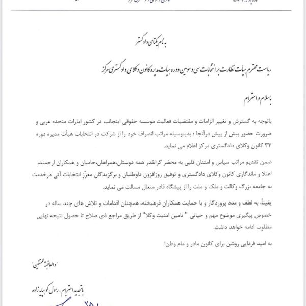 ریاست محترم هيات نظارت بر انتخابات سی و سومین دوره هيات مدیره کانون وکلای دادگستری مرکزمدیر سایت29 مرداد 1404به نام یکتای دادگستر ریاست محترم هيات نظارت بر انتخابات سی و سومین دوره هيات مدیره کانون وکلای دادگستری مرکز ...
